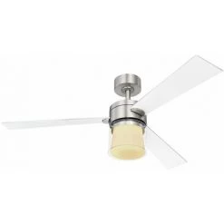 la description Le ventilateur de plafond à trois pales de couleur argent et nickel mat est alimenté par un moteur de 40 watts et peut être contrôlé dans deux directions. L’illuminant inclus émet 990 lumens de luminosité dans la pièce à travers l’abat-jour intérieur en acrylique opale et l’abat-jour extérieur en verre transparent. Vous pouvez régler la couleur de la lumière entre la lumière blanche chaude (3000 Kelvin) et la lumière du jour (6000 Kelvin) avec la télécommande fournie. Avec une hauteur de 45 cm et un diamètre de 132 cm, le ventilateur s’intègre dans les pièces modernes telles que les chambres, les bureaux, les couloirs, les salons ou les salles à manger. L’illuminant est installé en permanence dans la lampe.