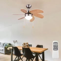 Description Ventilateur de plafond moderne avec éclairage et pales de couleur hêtre .