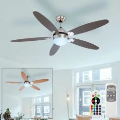 Description Ventilateur de plafond moderne avec éclairage et pales à couleurs changeantes en graphite ou en hêtre . Ce ventilateur de plafond moderne est un véritable accroche-regard. Les pales de ventilateur à couleurs changeantes et l’élément d’éclairage intégré mettent des accents particuliers dans votre intérieur. Un moteur silencieux et puissant assure une circulation d’air parfaite, ce qui est idéal pour les pièces d’une taille de 25 à 30 m². Lorsqu’il fait à nouveau chaud, que ce soit au travail ou à la maison, ce ventilateur de plafond apporte le refroidissement tant attendu, car un flux d’air descendant crée un effet rafraîchissant. Le ventilateur peut être activé à l’aide de l’interrupteur à tirette et de la télécommande. Trois niveaux de vitesse peuvent être réglés, de 85 tours à 185 tours par minute. Étant donné que l’air chaud monte jusqu’au plafond du salon, vous pouvez même utilisez ce ventilateur Économisez jusqu’à 30% sur les coûts de chauffage car il a un retour réglable, de sorte que l’air chaud est à nouveau pressé. Ce ventilateur a une particularité, car vous pouvez même le monter sur des plafonds avec un angle d’inclinaison jusqu’à un maximum de 30°, afin que Vous puissiez également obtenir une parfaite circulation de l’air sous le toit. Les pales du ventilateur peuvent être installées en deux couleurs différentes. Par rapport aux éclairages « normaux », utilisez des LED – Les éclairages en surbrillance n’ont qu’une quantité minimale d’électricité et consomment encore moins que les lampes à économie d’énergie. Cela préserve l’environnement et votre portefeuille. Une source de lumière LED de 3,5 watts de haute qualité et à économie d’énergie avec télécommande pour la lumière blanche et le contrôle RVB est inclus dans le Contenu de la livraison inclus. Détails • Type de produit : Ventilateur de plafond