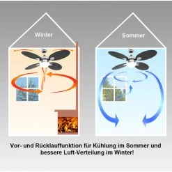 Le ventilateur peut être commuté à l’aide de l’interrupteur à tirette. Trois niveaux de vitesse peuvent être réglés, de 115 tours à 235 tours par minute. Comme l’air chaud monte toujours jusqu’au plafond du salon, vous pouvez même économiser jusqu’à 30 % sur les frais de chauffage avec ce ventilateur, car il a un retour réglable pour que l’air chaud soit repoussé vers le bas. Ce ventilateur a une particularité, car vous pouvez même le monter sur des plafonds avec un angle d’inclinaison allant jusqu’à 30°, de sorte que vous puissiez également obtenir une circulation d’air parfaite sous le toit. Les projecteurs LED ne consomment qu’une quantité minimale d’électricité et consomment même moins que les lampes à économie d’énergie. Cela protège l’environnement et votre porte-monnaie. Une ampoule LED SMD de haute qualité à économie d’énergie est incluse dans la livraison.