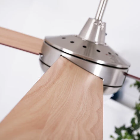Ce ventilateur de plafond moderne est un vĂ©ritable accroche-regard. Les pales de ventilateur interchangeables (hĂȘtre/noyer) et l’Ă©lĂ©ment d’Ă©clairage intĂ©grĂ© mettent des accents particuliers dans votre dĂ©coration intĂ©rieure.  Lorsqu’il fait Ă nouveau chaud, que ce soit au travail ou Ă la maison, ce ventilateur de plafond apporte le refroidissement tant attendu, car un flux d’air vers le bas crĂ©e un effet de refroidissement. Le ventilateur peut ĂȘtre commutĂ© Ă l’aide de l’interrupteur Ă tirette. Trois niveaux de vitesse peuvent ĂȘtre rĂ©glĂ©s.
