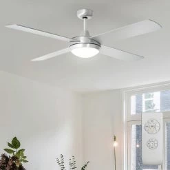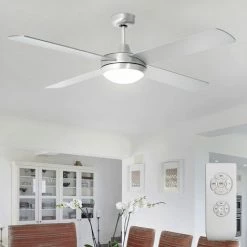 Ce ventilateur de plafond moderne est un vĂ©ritable accroche-regard. Les pales argentĂ©es du ventilateur et l’Ă©lĂ©ment d’Ă©clairage intĂ©grĂ© mettent des accents particuliers dans votre dĂ©coration intĂ©rieure.