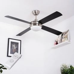 Ce ventilateur de plafond moderne est un vĂ©ritable accroche-regard. Les pales de ventilateur interchangeables (noir / blanc) et l’Ă©lĂ©ment d’Ă©clairage intĂ©grĂ© mettent des accents spĂ©ciaux dans votre intĂ©rieur.