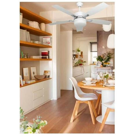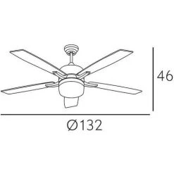 Ce ventilateur a un diamÚtre de 132 cm, et une hauteur de 46 cm., et intÚgre une lampe avec tulipe en verre comme diffuseur et des douilles adaptées aux ampoules LED 2XE27, pour vous donner une luminosité maximale et une consommation minimale. (Ampoules non incluses).