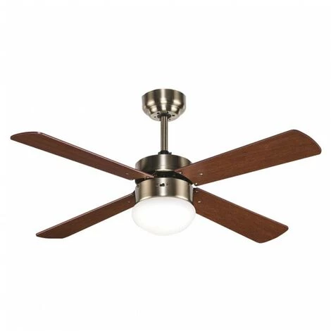 Ventilateur de plafond, finition cuir satinĂ© avec modĂšle lĂ©ger TRAMONTANA, avec Ă©clairage pour deux ampoules E 27 (convient pour led, ampoule non incluse). Il dispose de 4 lames ABS rĂ©versibles en finition cerise-noyer, et dâune tulipe en verre opale. Mesure 107 cm de diamĂštre et 40 cm de hauteur.