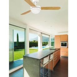 Ventilateur de plafond modĂšle FEROE de la marque FARO avec lumiĂšre. Dispose d’un moteur AC avec une puissance maximale de 8W et 3 vitesses: 10-21-41 W / 80-145-180RPM. ActionnĂ© Ă l’aide d’une tĂ©lĂ©commande. Le corps est en acier couleur blanc mat, dispose de 3 lames de MDF de couleur blanc et arce et a un diamĂštre de 1070 mm. Le diffuseur est en verre. Ce ventilateur est compatible avec une source lumineuse E14, n’est pas inclu. Vous avez la possibilitĂ© de remplacer la tige pour une tige d’extension de taille diffĂ©rente. Il convient Ă une installation sur un plafond en pente jusqu’Ă 30Âș. Ce ventilateur de plafond e adaptĂ© pas pour l’extĂ©rieur.