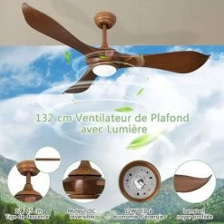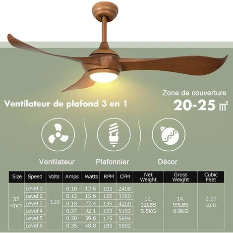 - Notre ventilateur multifonctionnel peut ĂȘtre utilisĂ© comme ventilateur, dispositif dâĂ©clairage ou dĂ©coration en fonction de vos besoins. La tĂ©lĂ©commande fournie vous permet dâajuster librement la vitesse du vent et lâintensitĂ© de luminositĂ© Ă distance, et les pales en ABS de qualitĂ© garantissent une forte rĂ©sistance Ă lâhumiditĂ© et Ă la dĂ©formation. Le moteur courant continu permet une utilisation silencieuse, et la faible consommation dâĂ©nergie aide Ă baisser le budget domestique. Ce ventilateur de plafond vous offre 2 modes, 6 vitesses et 3 intensitĂ©s de luminositĂ© au choix, amĂ©liorant considĂ©rablement votre qualitĂ© de vie. NâhĂ©sitez plus !