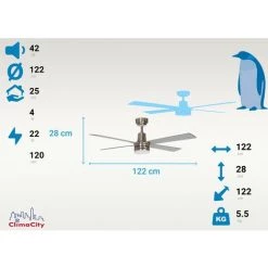 L?ELECTRON est un ventilateur de plafond complet à LED 12 W qui se distingue par sa multifonctionnalité. Il a un moteur à courant continu de 20 W qui atteint 212 tours par minute, en plus de ses 4 pales MDF et de grand diamÚtre (122cm) le rendent idéal pour les surfaces jusqu?à 25m2.