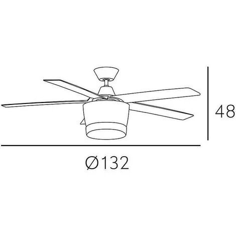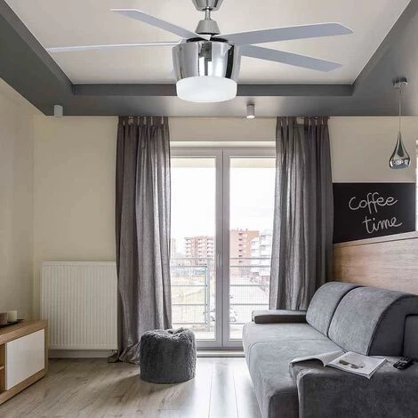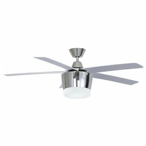 Ventilateur de plafond avec lampe modÚle BALI en métal, abs et verre, de couleur chrome avec 5 pales en finition argent. Mesurant 48 cm de hauteur et 132 cm de diamÚtre.