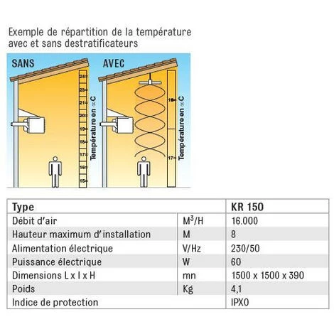 – Dâun trĂšs bon rapport qualitĂ© /prix, le KR 150 permet de rĂ©aliser jusquâĂ 30% dâĂ©conomie de carburant en rĂ©cupĂ©rant les calories dans les parties hautes des locaux, tout en amĂ©liorant le confort en rendant la tempĂ©rature dans les bĂątiments plus homogĂšne.