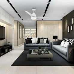 Ventilateur de plafond avec moteur AC, 132cm de diamĂštre, idĂ©al pour les piĂšces de plus de 20M2. Avec corps fini en blanc, avec trois lames en ABS blanc. Avec lumiĂšre LED 18W et 1500lm qui est contrĂŽlĂ©e avec une tĂ©lĂ©commande incluse, avec minuterie. Il est Ă©galement possible de rĂ©gler la tempĂ©rature de couleur (2700-5000K). RPM : 90/140/215 ; Consommation (W/h) : 22/51/80 ; DĂ©bit d’air (m3/min) : 43/110/160 et Niveau sonore (dB) : 25/29/35 ; Dimensions (cm) : 132x45cm