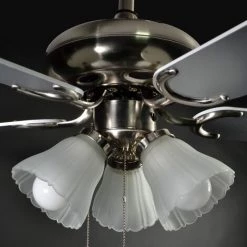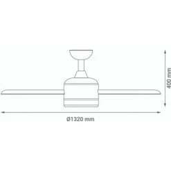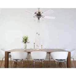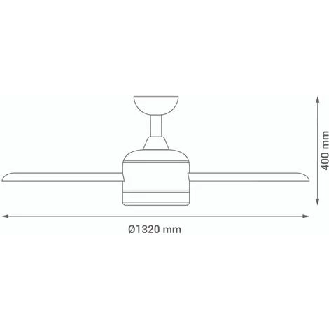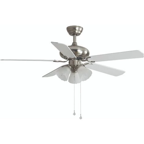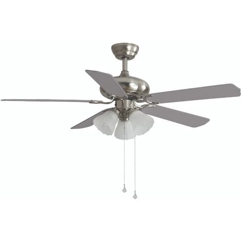 Ventilateur de plafond avec moteur AC, 132cm de diamĂštre, ce qui le rend adaptĂ© aux surfaces supĂ©rieures Ă 20M2. Avec un corps finition nickel et cinq pales rĂ©versibles blanc et gris argent. Avec trois abat-jour en verre opale et ampoules E27 (Maximum 40W) non incluses. Il est activĂ© au moyen de deux chaĂźnes avec une poignĂ©e dĂ©corative. RPM : 105/160/195 ; Consommation : 28/46/65 W/h ; DĂ©bit d’air : 85/127/155 m3/min ; Niveau sonore : 38/43/49 dB. Dimensions : 132x40cm ;