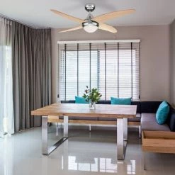 Ventilateur de plafond DC de 122cm de diamĂštre, idĂ©al pour les piĂšces de 14 Ă 20M2. Avec corps en mĂ©tal en nickel et quatres lames en plywood bois pine. Moteur Ă courant continu de haute qualitĂ© qui permet des performances Ă©levĂ©es avec une consommation et un son minimaux. Fonction Ă©tĂ© / hiver incluse. Pour deux ampoules E27, non incluses, qui est contrĂŽlĂ©e par la tĂ©lĂ©commande avec une minuterie.Dimensions (cm): 122×40-52,5cm; RPM: 95-120-140-174-208-230; Consommation (W): 3-5-7-12-20-28; DĂ©bit d’air (m3 /min): 50-85-95-130-140-155 et Niveau sonore (dB): 30-37-40-45-50-55.
