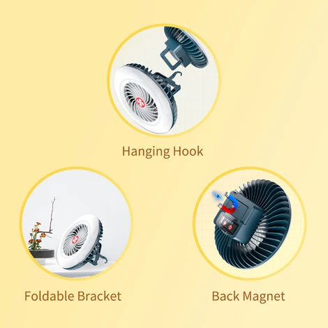 [Facile Ă installer] Le ventilateur suspendu Ă LED est livrĂ© avec un support pliable pour une utilisation facile sur une table, un crochet pour accrocher au sommet de la tente et un aimant arriĂšre qui peut ĂȘtre fixĂ© Ă la surface mĂ©tallique.