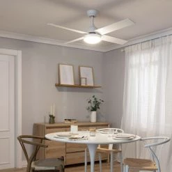 Le Ventilateur de Plafond LED Extérieur Hayworth Blanc 127cm Moteur DC de 40W intÚgre une source lumineuse LED de 15W en CCT, avec un look minimaliste et élégant qui en fait un élément décoratif et fonctionnel.