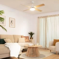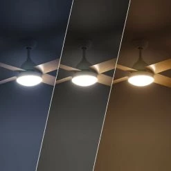 Le Ventilateur de Plafond LED Extérieur Hayworth Bois 127cm Moteur DC de 40W intÚgre une source lumineuse LED de 15W en CCT, avec un look minimaliste et élégant qui en fait un élément décoratif et fonctionnel.