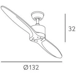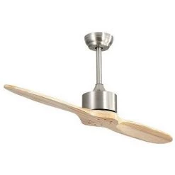 Ventilateur de plafond sans modĂšle lĂ©ger LESTE dans la couleur nickel satinĂ© avec deux lames en bois fini de haricot. Il est Ă©quipĂ© dâun moteur DC et de cinq vitesses. Taille 32 cm de hauteur et 132 cm de diamĂštre.