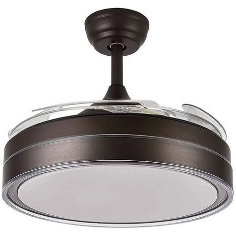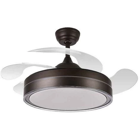 Ventilateur de plafond avec modĂšle LED intĂ©grĂ© CRIADOR en finition marron avec quatre pales PLIANTES de mĂ©thacrylate trĂšs rĂ©sistant de couleur transparente. Il est Ă©quipĂ© dâun moteur Ă courant continu et de six vitesses.