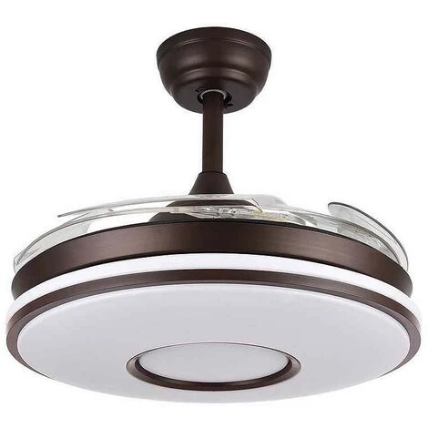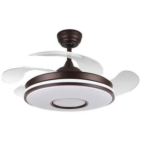 Ventilateur de plafond avec modĂšle LED intĂ©grĂ© DANI en finition marron avec quatre pales FOLDING en mĂ©thacrylate trĂšs rĂ©sistant de couleur transparente. Il est Ă©quipĂ© dâun moteur Ă courant continu et de six vitesses.
