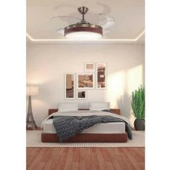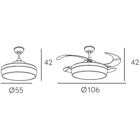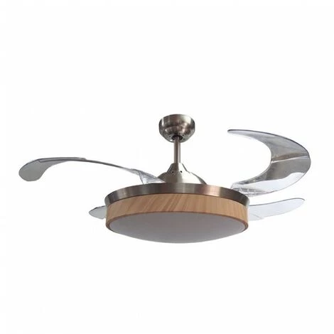 Ventilateur de plafond avec le modĂšle de plafon de LED ZONDA fait de mĂ©tal, de bois et de mĂ©thacrylate, dans la couleur NIQUEL-HAYA avec quatre lames de mĂ©thacrylate desPEGABLE trĂšs rĂ©sistantes de couleur transparente. Taille 42×55 centimĂštres avec lames pliĂ©es et 42×106 centimĂštres avec des lames dĂ©pliĂ©es.
