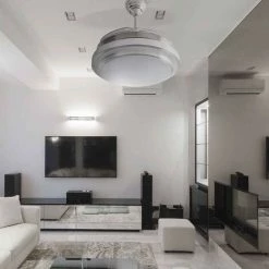 Ce modĂšle de ventilateur a un design moderne et grĂące Ă son format, avec des pales dĂ©pliables, nous pouvons lâutiliser comme lampe tout au long de lâannĂ©e, en plus de pouvoir choisir le type de lumiĂšre qui nous intĂ©resse le plus Ă tout moment, quâelle soit chaude-neutre-froide.