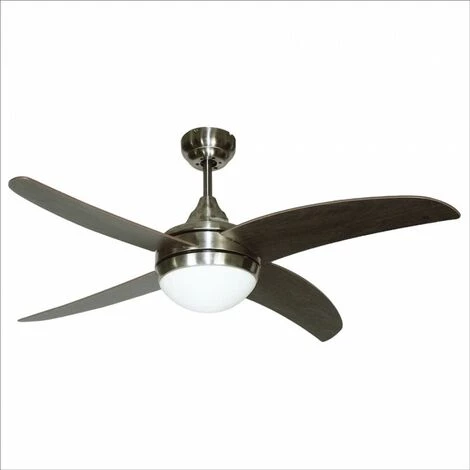 Ventilateur de plafond avec modÚle léger OSIRIS en finition nickel satiné, en métal, bois MDF et verre, avec 4 pales wengue. Mesurant 45 cm de hauteur et 116 cm de diamÚtre.